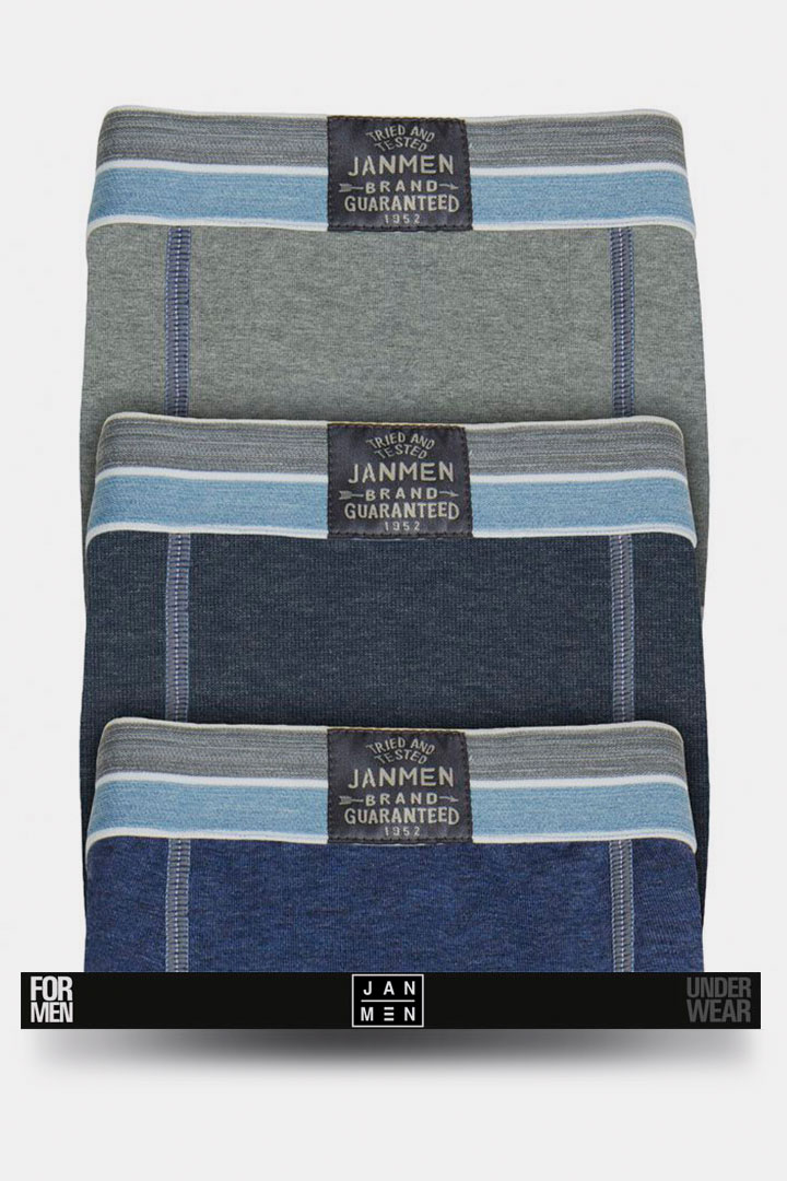 Serie de viscosa, fresca y agradable para el verano. Boxer y slip con goma de fantasía de rayas horizontales a tono con los colores del tejido y de las costuras. Packs de 2 bicolor, Light Grey/Denim y Green/Grey. Packs de 3 tricolor, Light Grey, Denim y Jeans.